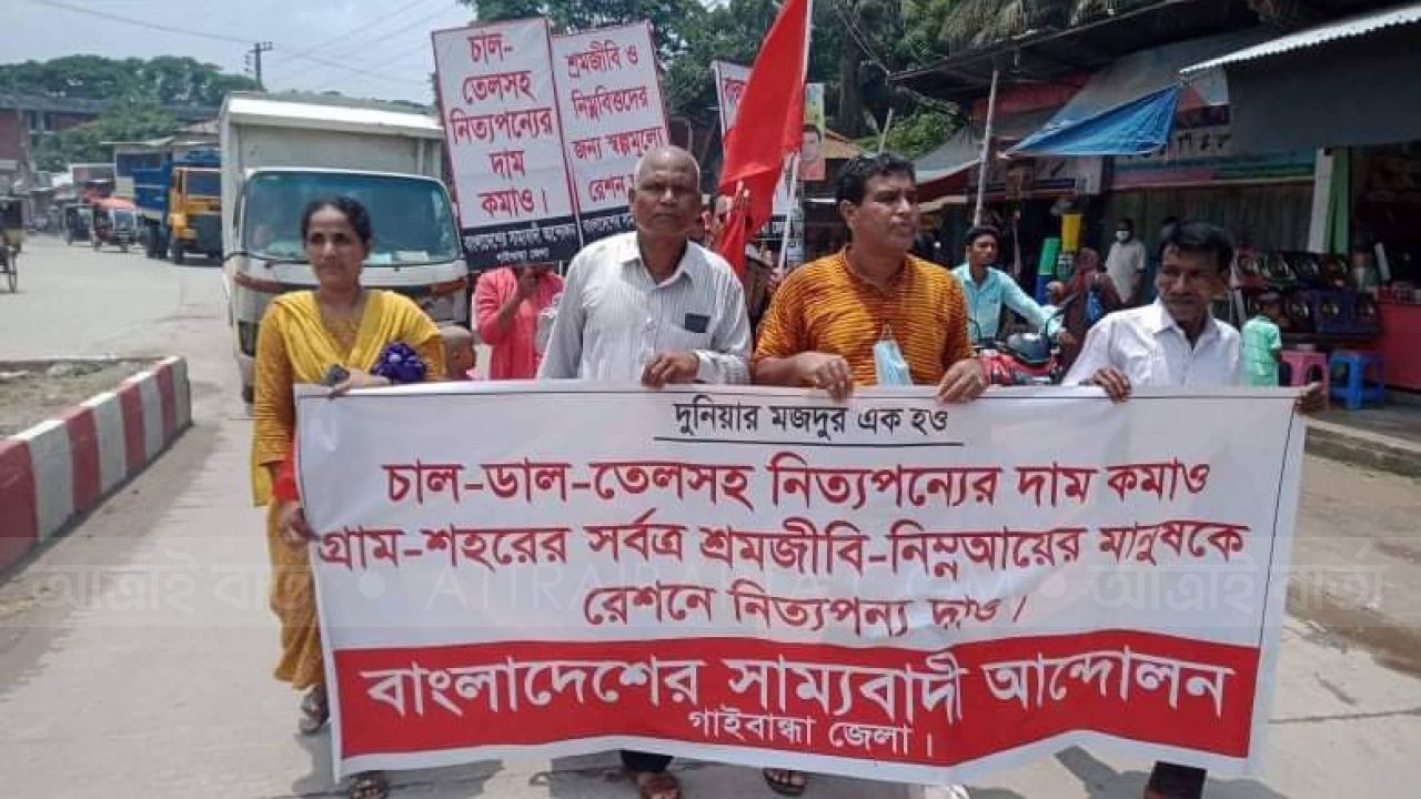 সোয়াবিন তেলসহ নিত্যপন্যের লাগামহীন উর্ধ্বগতির প্রতিবাদ ও শ্রমজীবি-নিম্নআয়ের মানুষদের আর্মিরেটে রেশন সরবরাহের দাবীতে আজ ১১মে, বুধবার সকাল সাড়ে১১টায় বাংলাদেশের সাম্যবাদী আন্দোলন গাইবাান্ধা জেলা শাখার উদ্যোগে শহরের বিভিন্ন স্থানে পথসভা ও বিক্ষোভ মিছিল অনু্ষ্ঠিত হয়। এ সময় বক্তব্য রাখেন, জেলা সদস্য সচিব মনজুর আলম মিঠু, সমাজতান্ত্রিক ক্ষেতমজুর ও কৃষক ফ্রন্টের নেতা চপল সরকার, কৃষ্ণ চন্দ্র পাল, সবুজ মিয়া, বাংলাদেশ নারীমুক্তি কেন্দ্রের জেলা সভাপতি অধ্যাপক রোকেয়া খাতুন, পারুল বেগম, গণতান্ত্রিক ছাত্র কাউন্সিলের জেলা আহবায়ক শামিমআরা মিনা।