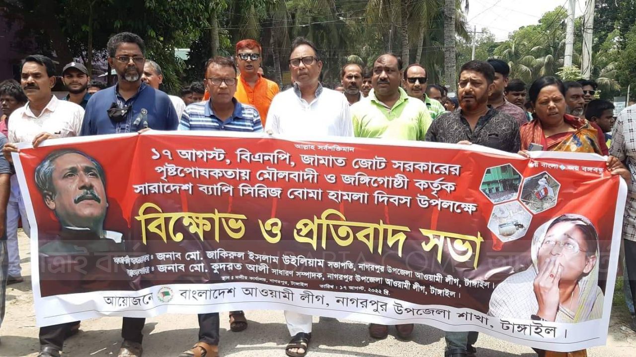 টাঙ্গাইলের নাগরপুরে সারাদেশের ন্যায় বাংলাদেশ আওয়ামী লীগ কেন্দ্রীয় কর্মসূচীর অংশ হিসেবে (১৭ আগষ্ট) বিএনপি, জামাত জোট সরকারের পৃষ্টপোষকতায় মৌলবাদী ও জঙ্গিগোষ্ঠী কর্তৃক সারাদেশ ব্যাপি সিরিজ বোমা হামলা দিবস উপলক্ষে নাগরপুর উপজেলা আওয়ামী লীগ এক বিক্ষোভ ও প্রতিবাদ সভা পালন করেছেন।