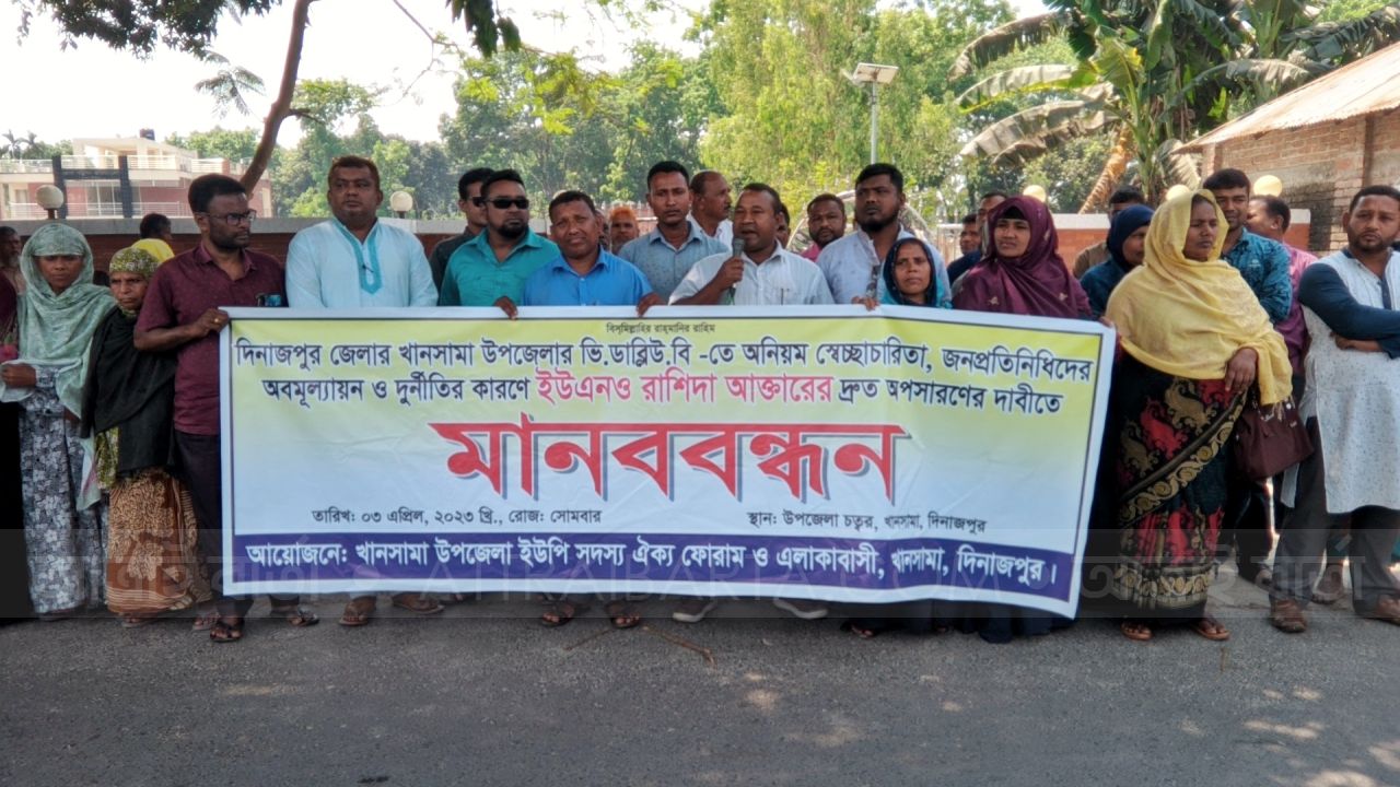 ভি.ডাব্লিউ.ডি (ভিজিডি)তে অনিয়ম, স্বেচ্ছাচারিতা, জনপ্রতিনিধিকে অবমূল্যায়ন ও দূর্ণীতির প্রতিবাদে দিনাজপুরের খানসামায় উপজেলা নির্বাহী কর্মকর্তা (ইউএনও) রাশিদা আক্তার অপসারণের দাবিতে মানববন্ধন কর্মসূচি পালিত হয়েছে।
