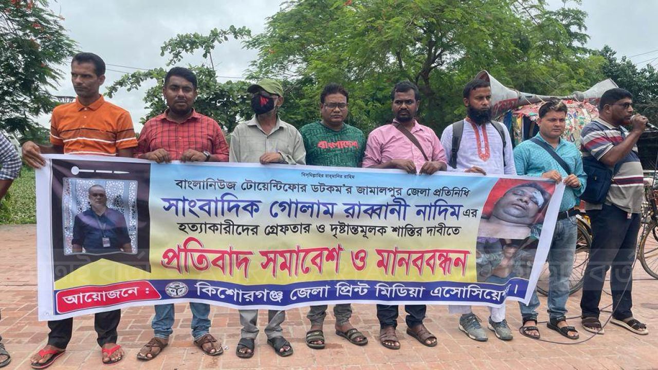 সংবাদ প্রকাশের জেরে জামালপুরের বকশীগঞ্জের ৭১ টেলিভিশনের সাংবাদিক গোলাম রাব্বানী নাদিমকে হত্যার প্রতিবাদে ও হত্যাকারীদের দৃষ্টান্তমূলক শাস্তির দাবিতে কিশোরগঞ্জে মানববন্ধন ও প্রতিবাদ সমাবেশ অনুষ্ঠিত হয়েছে।