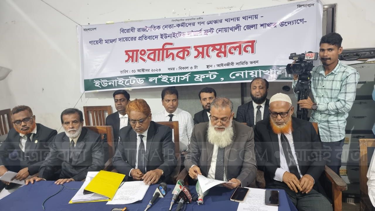 নোয়াখালীতে বিএনপি-জামায়াতের নেতাকর্মিদের গায়েবি মামলায় গণগ্রেপ্তারের অভিযোগ করেছে নোয়াখালী ইউনাইটেড লইয়ার্স ফ্রন্ট নেতৃবৃন্দ।