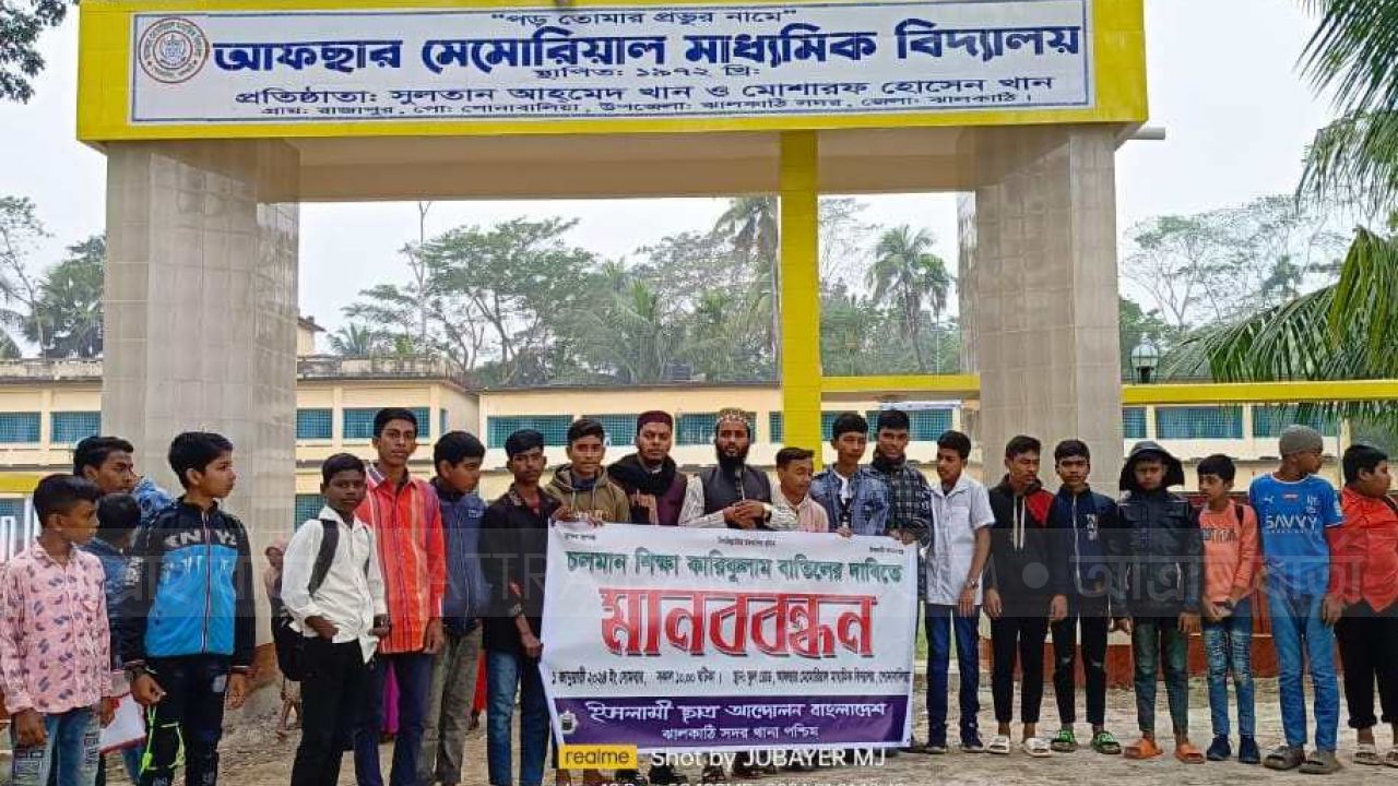 নতুন শিক্ষাক্রম বাতিলের দাবিতে ঝালকাঠিতে ইসলামী ছাত্র আন্দোলনের মানববন্ধন