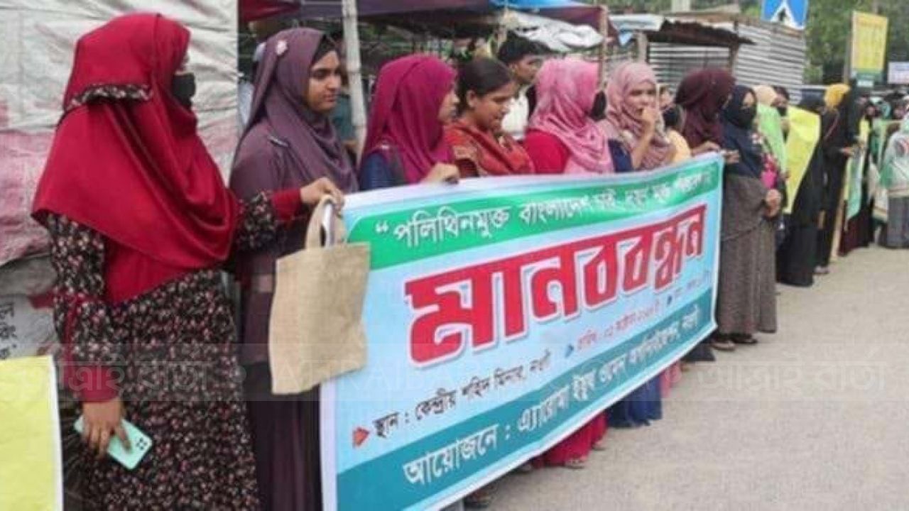 নওগাঁ দূষণ মূক্ত চাই ও পলিথিন ব্যবহার নিরুৎসাহিত করতে মানববন্ধন কর্মসূচি পালিত